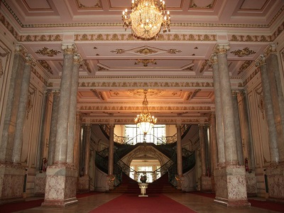 The palace consists of three main floors. The first floor has a collection of Roman-Greek columns of green and yellow marble with gold crowns on top. It also has a reception hall on the left side of the entrance door.  Next to the reception hall, there are two big halls and a dinning room with capacity of 49 people.