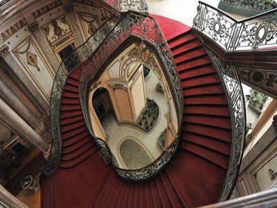 The second floor has eight bedrooms, each of which has a salon and a large marble bathroom, and the room walls decorated with colorful flowers and roses patterns.  The main hall is on the left side as you enter from the stained-glass door, and there are two reception halls reached through a large copper staircase covered in gold. The staircase has two sides elevating the level of the palace’s floors.